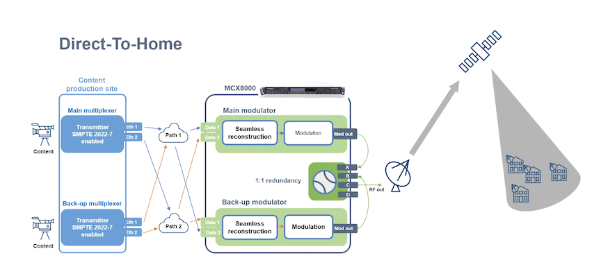 In Distribution to Towers (DTT), the MCX8000 ideally fits as a satellite front-end, feeding multiple Integrated Receiver Decoders (IRDs), and one MCX8000 in a multi-carrier, multi-stream configuration can be used for hundreds of TV channels.