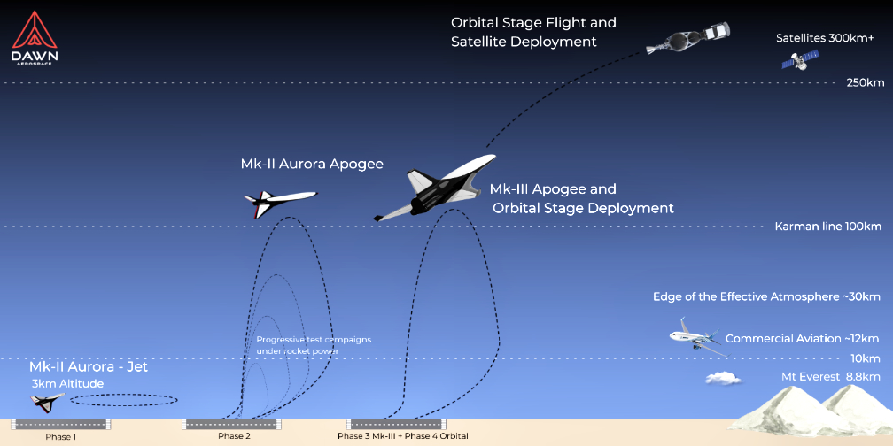 The Mk-II is intended to prove the core technology needed for a fully and rapidly reusable, first stage booster. Once the Mk-II Aurora is proven under rocket power, a much larger Mk-III vehicle will be built, with the capability to deliver a 250 kg. satellite into orbit using a second stage released at high altitude.