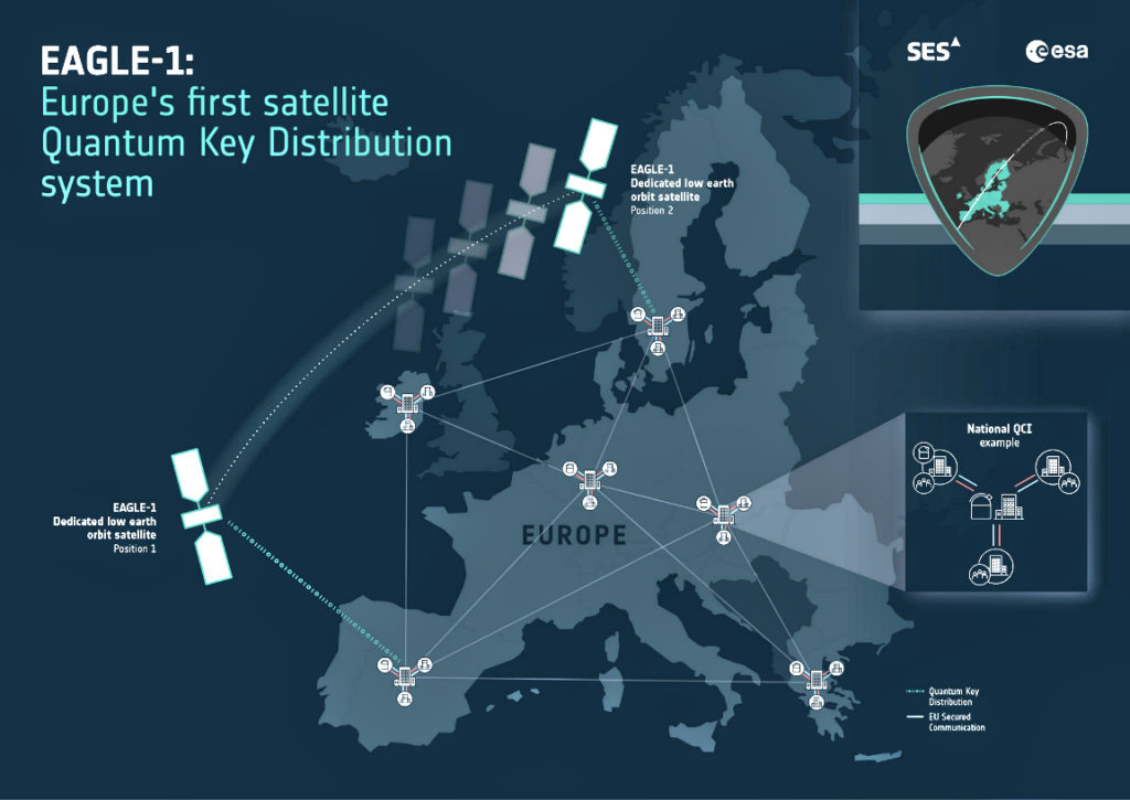 An SES-led consortium of 20 European companies, with the European Space Agency (ESA) and European Commission support, will design, develop, launch and operate the EAGLE-1 satellite-based end-to-end system for secure Quantum Key Distribution (QKD), enabling on-orbit validation and demonstration of next-generation cybersecurity across Europe.