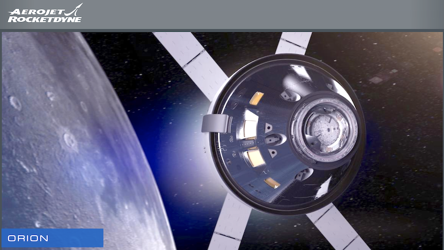 As it continues its journey, Orion, built by Lockheed Martin, will rely on Aerojet Rocketdyne propulsion systems for maneuvering and orientation. On the Orion service module, Aerojet Rocketdyne provides the Orion Main Engine, which is a 6,000 pounds of thrust engine derived from the Space Shuttle’s Orbital Maneuvering System and eight 100 pounds of thrust auxiliary engines with heritage back to Apollo. On the crew module, Aerojet Rocketdyne provides twelve 160 pounds of thrust reaction control thrusters that will control the crew module’s orientation for re-entry into Earth’s atmosphere.