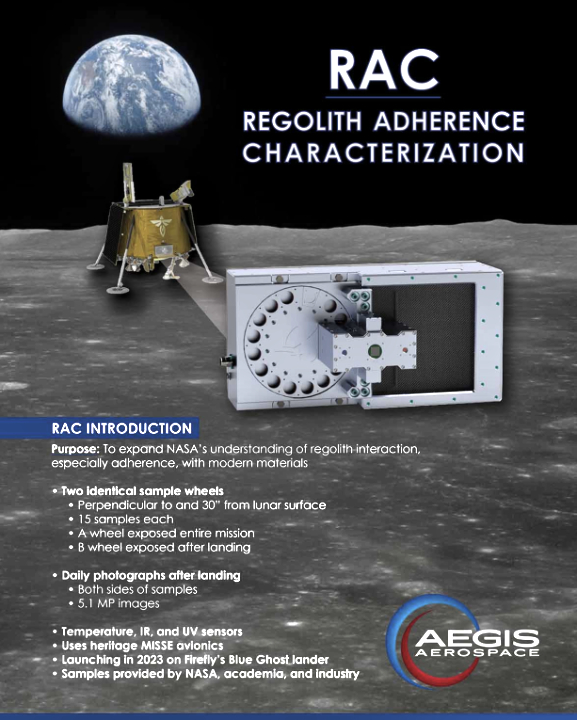 Aegis Aerospace Inc. has delivered their lunar payload — RAC-1 — along with its 15 customer material experiments, to Firefly Aerospace for integration onto the Blue Ghost Mission 1 lunar lander that is scheduled to launch in May of 2024.