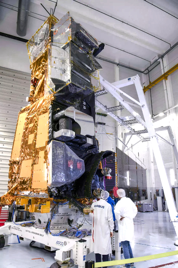 Integration of MetOp-SG-B was completed last week at Airbus in Friedrichshafen (Germany) with the installation of the advanced scatterometer and the spacecraft is about to undergo its environmental test campaign. This scatterometer provides double the resolution than the previous, and will be used to monitor ocean winds and continental ice sheets, and to check land-surface soil moisture — a key driver of water and heat fluxes between the ground and the atmosphere.