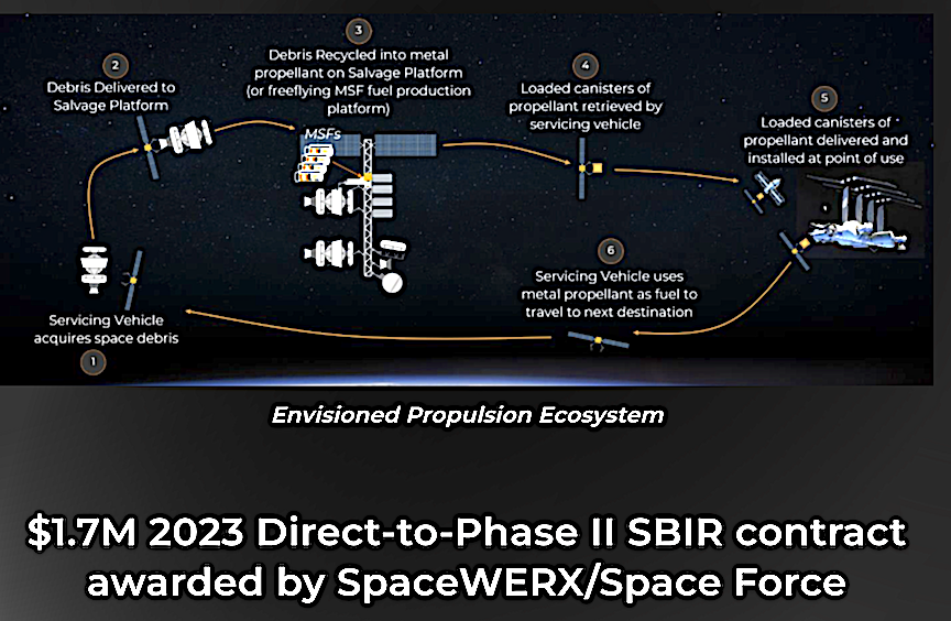 Recycling technology takes recovered space debris and reprocesses it into standardized metal feedstock in the form of rod, wire filament, and other useful geometries, as well as propellant.