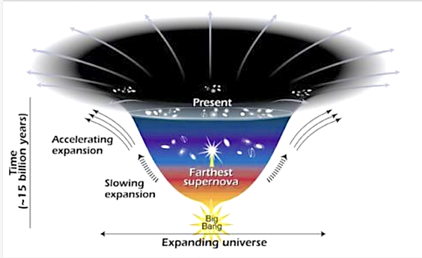 This diagram reveals changes in the rate of expansion since the universe’s birth 15 billion years ago. The more shallow the curve, the faster the rate of expansion. The curve changes noticeably about 7.5 billion years ago, when objects in the universe began flying apart as a faster rate. Astronomers theorize that the faster expansion rate is due to a mysterious, dark force that is pulling galaxies apart.