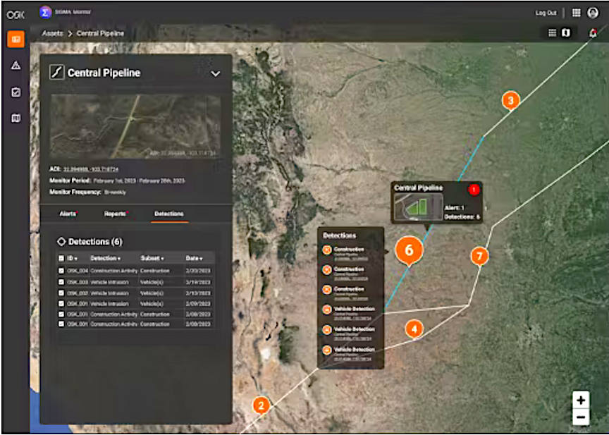 In order to detect leaks early and prevent them altogether, energy infrastructure companies need accurate information about their pipelines, and they need it in real time. The proprietary hyperspectral data and satellites are leveraged to continuously monitor pipelines for partners. The 8m GSD informs customers not only where leaks occur, but if it’s their assets that are leaking or someone else’s. One of OSK’s new features is the ability to identify where a company’s well pad locations are and whether leaks occur around the well pad areas or on the pipeline. This is an important distinction for energy infrastructure companies looking to proactively manage their emissions.