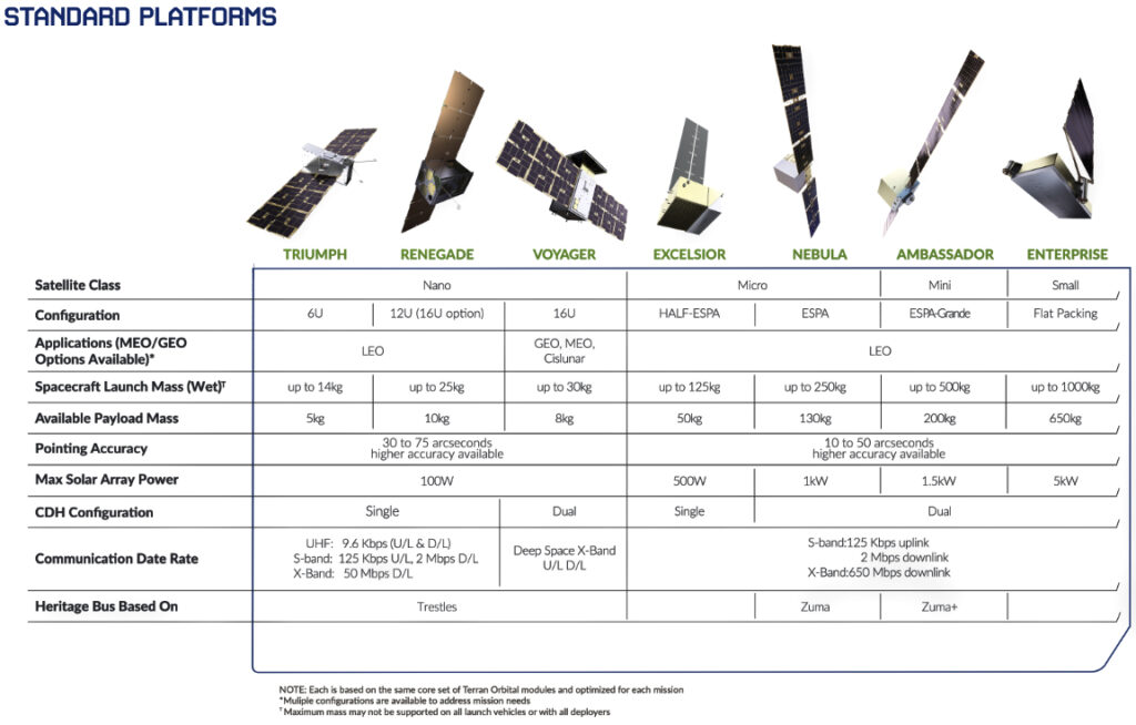 Terran Orbital will be partnering with best-of-breed payload suppliers to stock a wide range of payloads. This will allow the fulfillment of any customer requirements, whether Electro-Optical Imaging, Synthetic Aperture Radar, Communications, Hyperspectral, or any other payload with global demand.