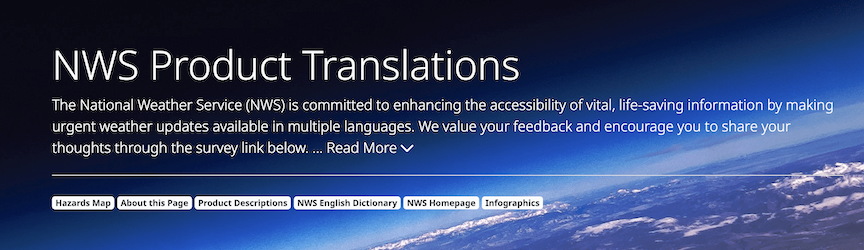 Future capabilities to expand the reach of these translations and/or enable private sector innovation include placing translations into the NWS API, putting them in Common Alerting Protocol format and triggering automated posts on social media in multiple languages.