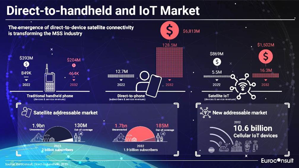 Consistent with a forecasted decline in market demand and the cannibalization of competing services, Euroconsult’s report asserts that traditional handheld phone users will decline by nearly half, while the direct-to-phone market will see a rising user count by 2032 to around 130 million. In addition, IoT devices are expected to triple over the coming decade, largely due to the increased accessibility of satellite IoT solutions offered by new market entrants.