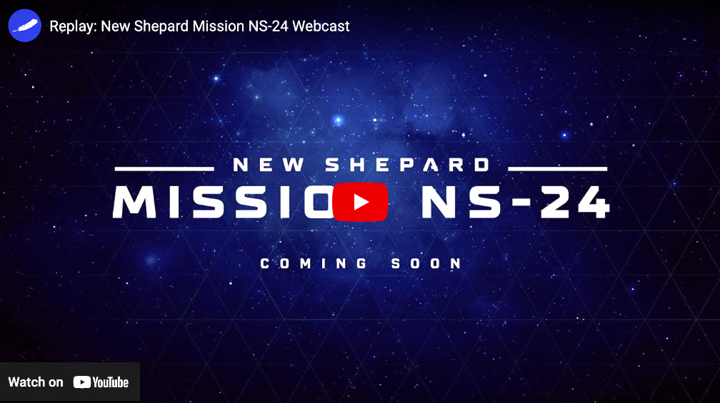 The NS-24 launch window opens at 8:30 AM CST / 14:30 UTC from Launch Site One in West Texas and the webcast starts at T-20 minutes at BlueOrigin.com.