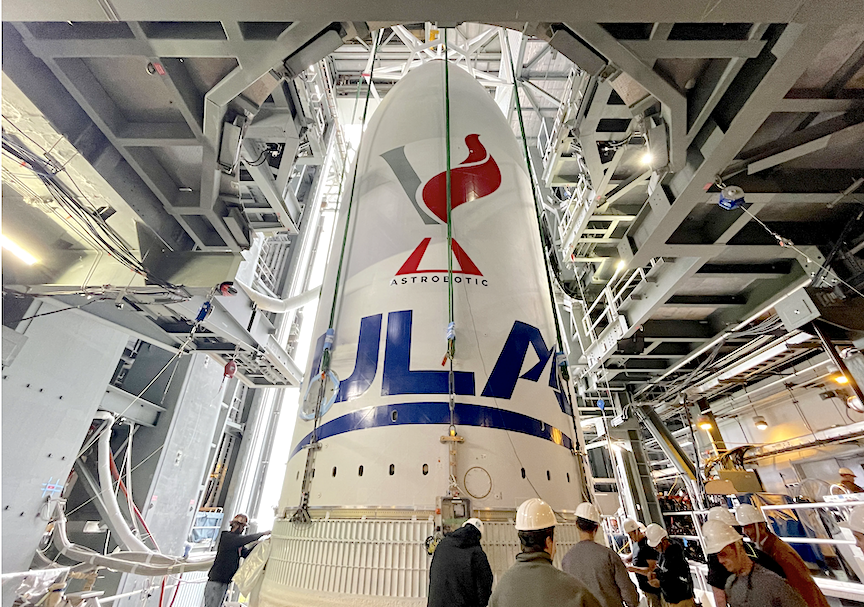 This morning, ULA technicians attached the lifting sling to the payload and hoisted it into the VIF for connection to the Centaur V upper stage of the Vulcan rocket, which now stands fully assembled at 202 feet (61.6 meters) tall.