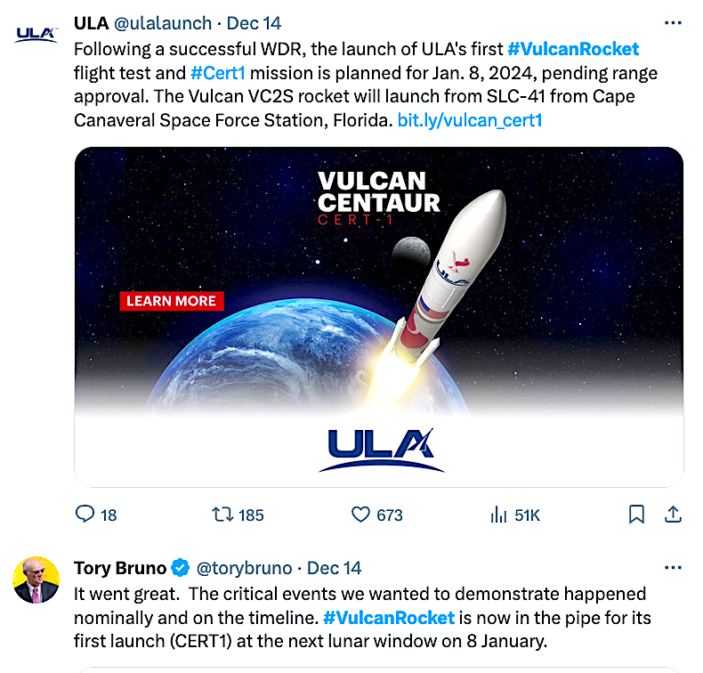 UPDATE 4: Everything continues to progress towards the first ULA Vulcan flight test and certification mission (Cert-1). The mission is planned to lift off on Monday, Jan. 8 from Space Launch Complex-41 at Cape Canaveral Space Force Station in Florida. The launch window opens at 2:18 a.m. EST. Today’s forecast shows an 85 percent chance of favorable weather conditions for launch.