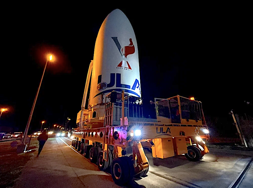The Cert-1 cargo, already encapsulated in the composite payload fairing measuring 17.7 feet (5.4 meters) in diameter and 51 feet (15.5 meters) in length, was moved overnight from the payload processing facility to ULA’s Vertical Integration Facility (VIF) adjacent to Space Launch Complex (SLC)-41.