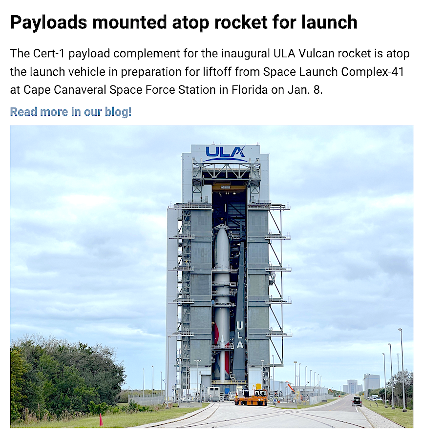 UPDATE 2: The payload complement for the inaugural United Launch Alliance (ULA) Vulcan rocket is atop the launch vehicle in preparation for liftoff from Cape Canaveral Space Force Station in Florida on Jan. 8 at 2:18 a.m. ET.