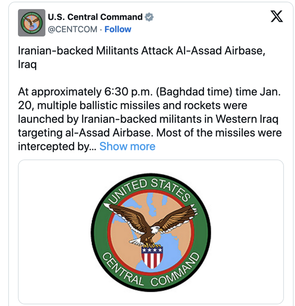 The US military said, “most of the missiles were intercepted by the base’s air defense systems while others impacted on the base.” At least one Iraqi soldier was wounded in the attack and several US troops had to be examined for “traumatic brain injuries,” according to the US Central Command.