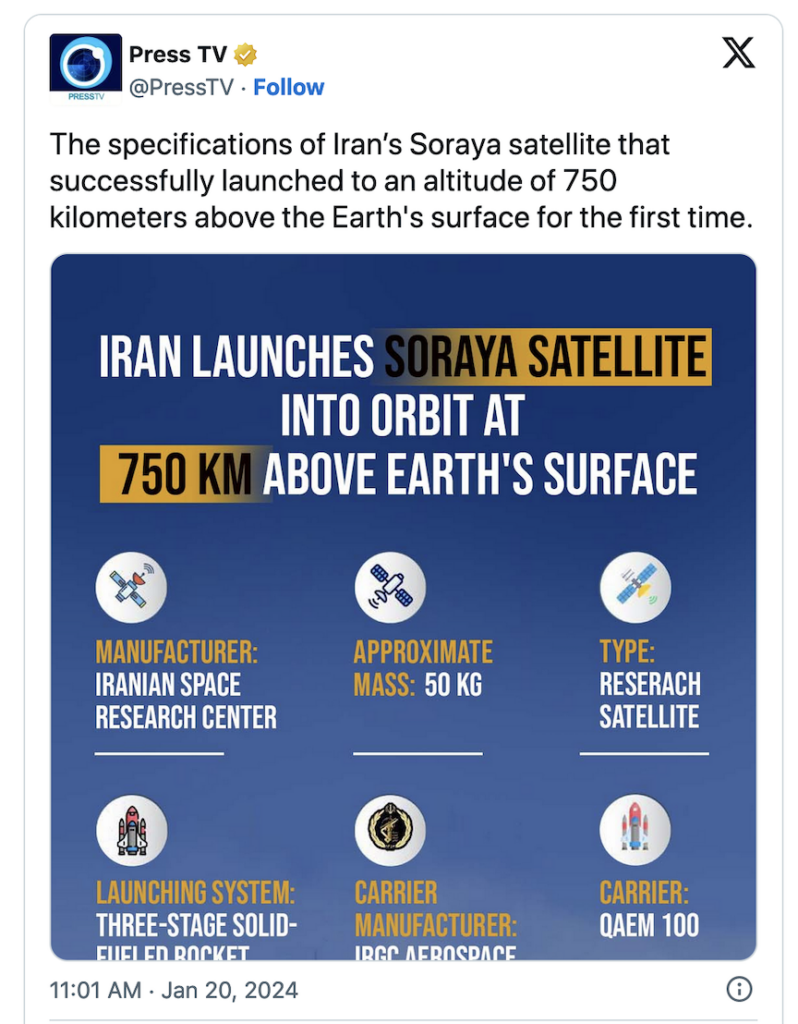The US government maintains that Iran’s satellite launches are in contravention of the United Nations Security Council Resoluton 2231, that formalized the 2014 JCPOA nuclear agreement. Nevertheless, the Biden administration allowed UN other UN restrictions related to Iran’s ballistic missile program to expire in October 2023, ignoring calls for its renewal.