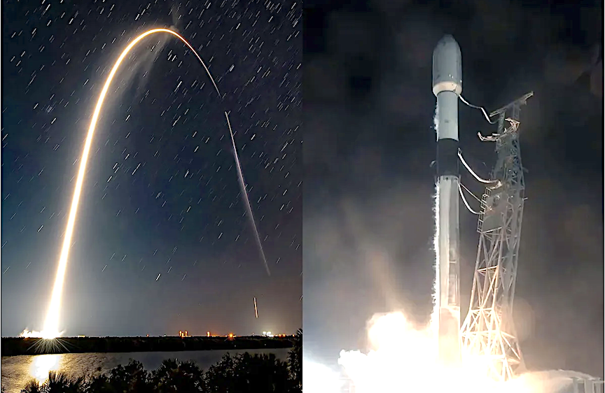 At right, a SpaceX Falcon 9 rocket lifts off with 22 Starlink satellites from Complex 4 East (SLC-4E) at Vandenberg Space Force Base in California early Monday morning. (Image credit: SpaceX / SpaceX via X)