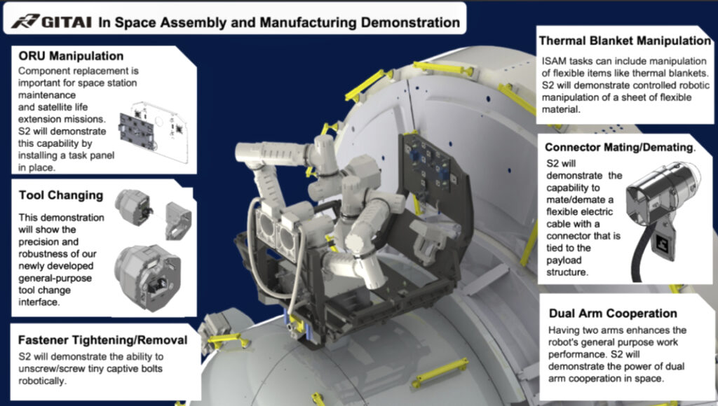 The S2 is the second demonstration mission for GITAI onboard the ISS. In 2021, GITAI successfully completed a technology demonstration of its S1 autonomous space robot and succeeded in executing two tasks: assembling structures and panels for In-Space Assembly (ISA), and operating switches and cables for Intra-Vehicular Activity (IVA).