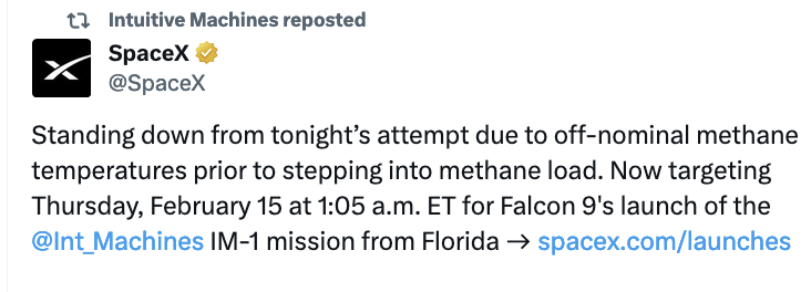 UPDATE 2: SpaceX and Intuitive Machines scrubbed the launch attempt originally planned for Wednesday morning. SpaceX is now targeting Thursday, February 15 for a Falcon 9 launch of the Intuitive Machines IM-1 mission to a lunar transfer orbit from Launch Complex 39A (LC-39A) at Kennedy Space Center in Florida. The instantaneous launch window is at 1:05 a.m. ET.