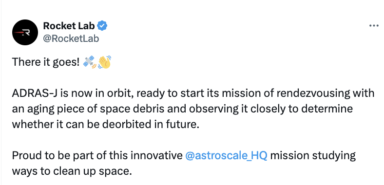 “The launch of ADRAS-J is a new chapter in Astroscale’s history as the first mission we have contracted for a space agency to successfully reach orbit,” said Eddie Kato, President and Managing Director of Astroscale Japan. “ADRAS-J is monumental for us as a company and for the entire sector as the mission will demonstrate the essential RPO capabilities for future on-orbit services. Thank you to all the Astroscale team, JAXA, our partners and supporters for their commitment and dedication to getting us to this point.”