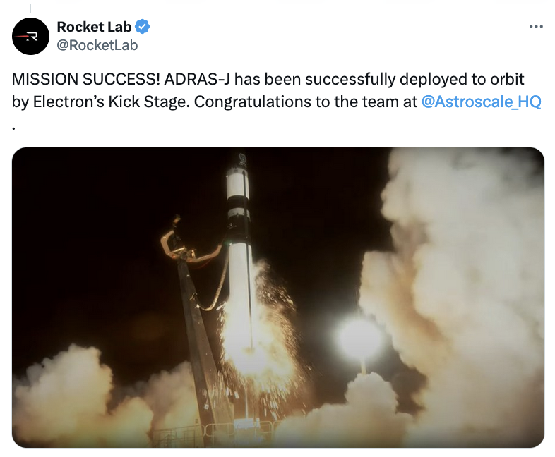 UPDATE 3: Astroscale Japan Inc. (“Astroscale Japan”), a subsidiary of Astroscale Holdings Inc. (“Astroscale”), provider of satellite servicing and long-term orbital sustainability across all orbits, confirmed the successful launch of its commercial debris inspection demonstration satellite, Active Debris Removal by Astroscale-Japan (ADRAS-J), from Rocket Lab’s Launch Complex 1 in Mahia, New Zealand on Sunday, February 18, at 2:52 pm UTC.