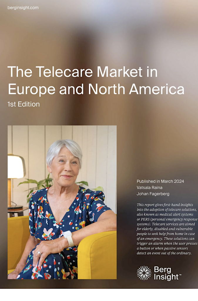 Berg Insight’s definition of telecare solutions, also known as medical alert systems or PERS (personal emergency response systems), is a service aimed for elderly, disabled and vulnerable people to seek help from home in case of an emergency. These solutions can trigger an alarm when the user presses a button or when a passive sensor detects an event out of the ordinary. These systems provide continuous in-home or completely mobile monitoring services and can consist of a range of electronic devices such as personal alarm buttons, motion detection sensors, GPS monitors or fitness devices. The market evolves to include AI solutions that automatically trigger an alarm for instance when a user leaves home at an unexpected time or forgets to take his or her medicine.