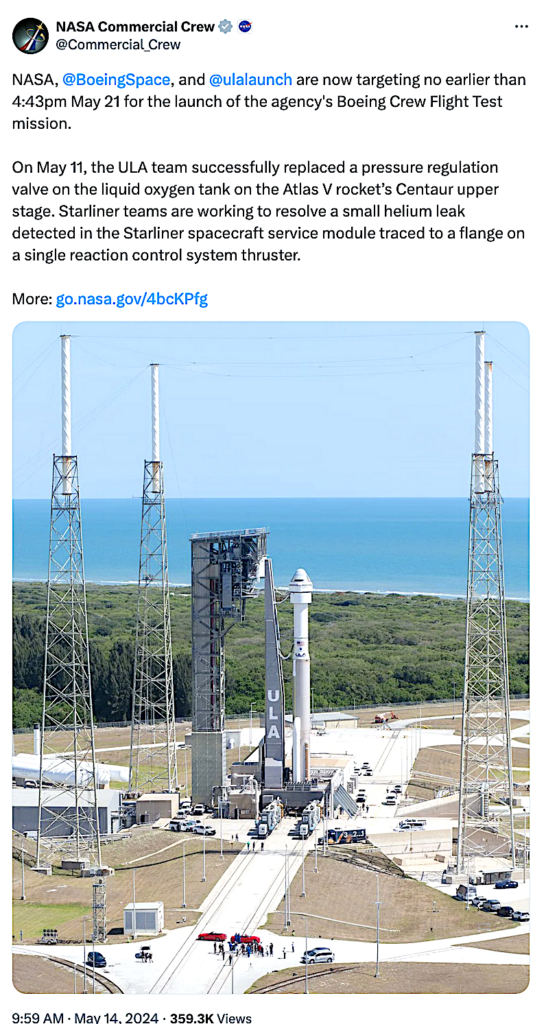 NASA’s Boeing Crew Flight Test now is targeted to launch no earlier than 6:16 p.m. EDT Friday, May 17, to the International Space Station. Following a thorough data review completed on Tuesday, United Launch Alliance decided to remove and replace a pressure regulation valve on the liquid oxygen tank on the Atlas V rocket’s Centaur upper stage.