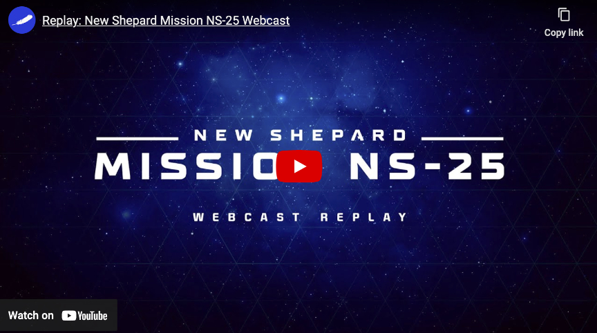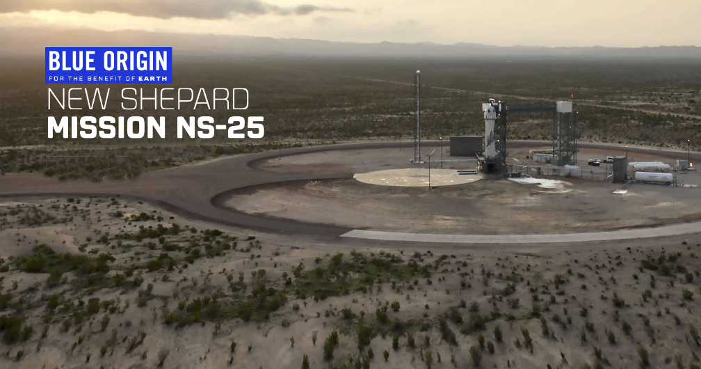 Blue Origin announces that its seventh human flight, NS-25, will lift off from Launch Site One in West Texas on Sunday, May 19. The launch window opens at 8:30 AM CDT / 1330 UTC. The webcast on BlueOrigin.com will start at T-40 minutes. New Shepard’s crewed NS-25 mission aims at May 19