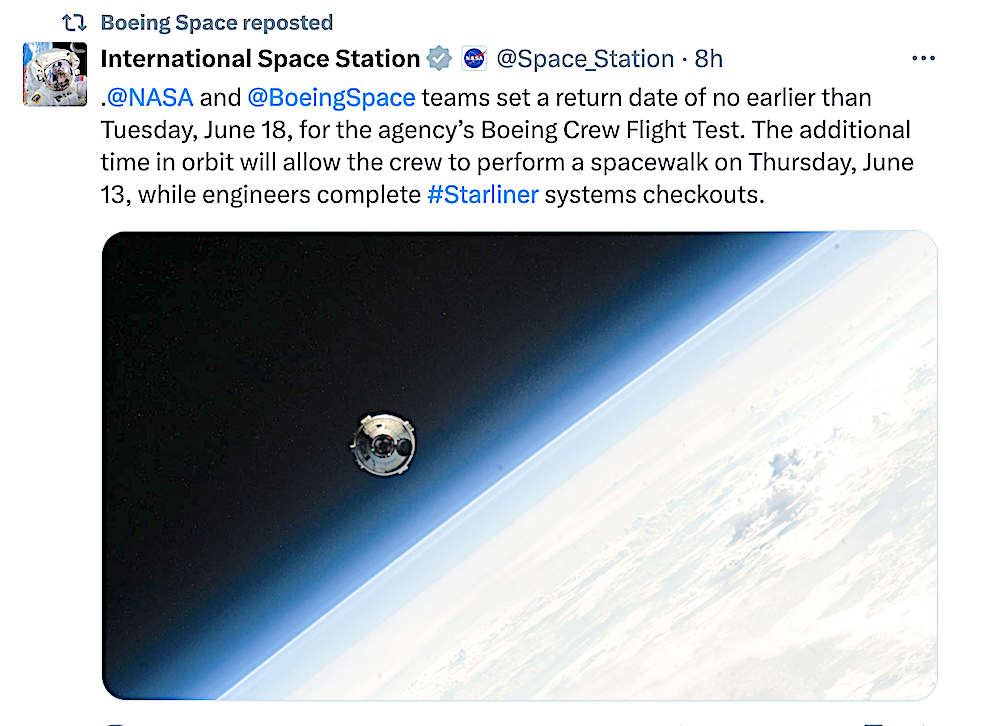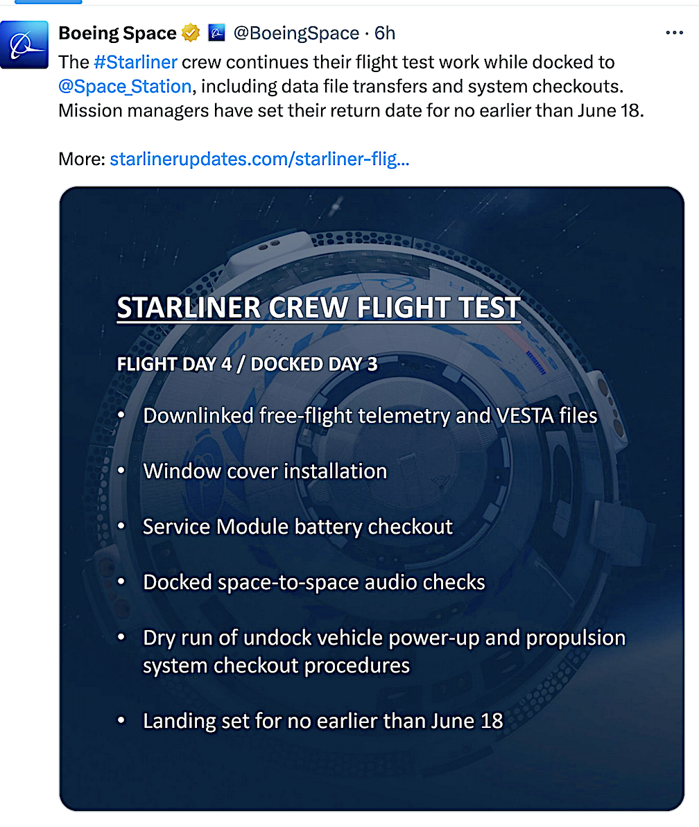 The crew was informed by CAPCOM Neal Nagata that mission managers are now targeting Starliner’s landing for no earlier than June 18. This paves the way for the crew to support additional station activities, such as the upcoming spacewalk on June 13, while engineers complete Starliner systems checkouts.