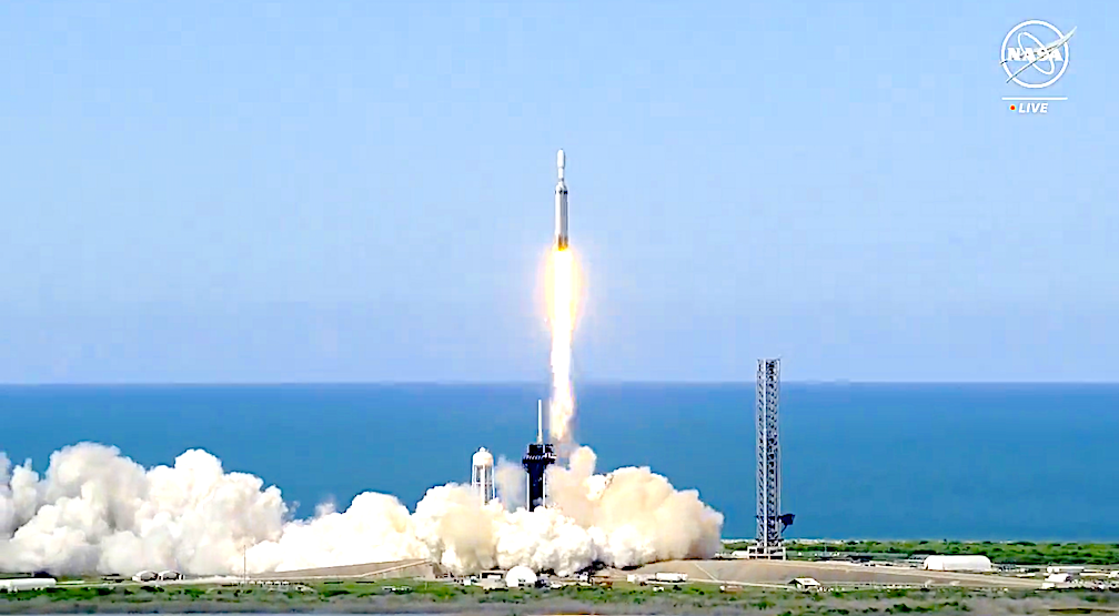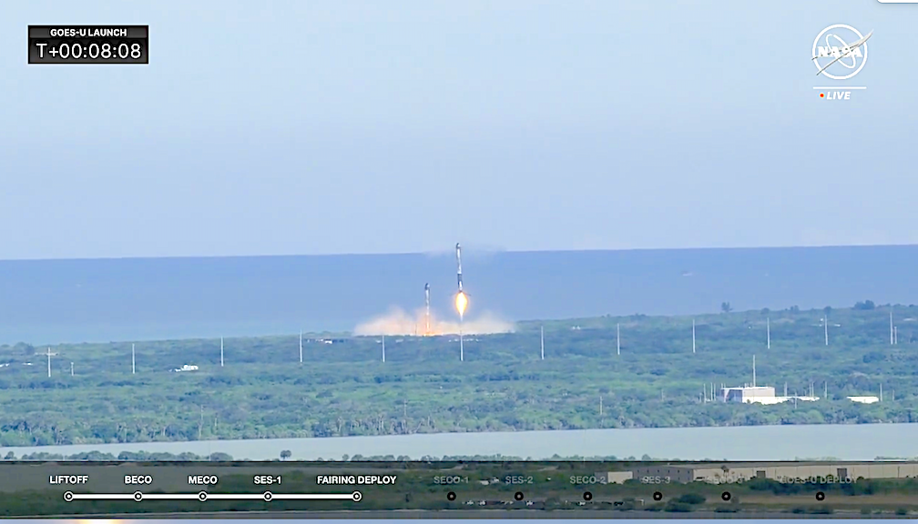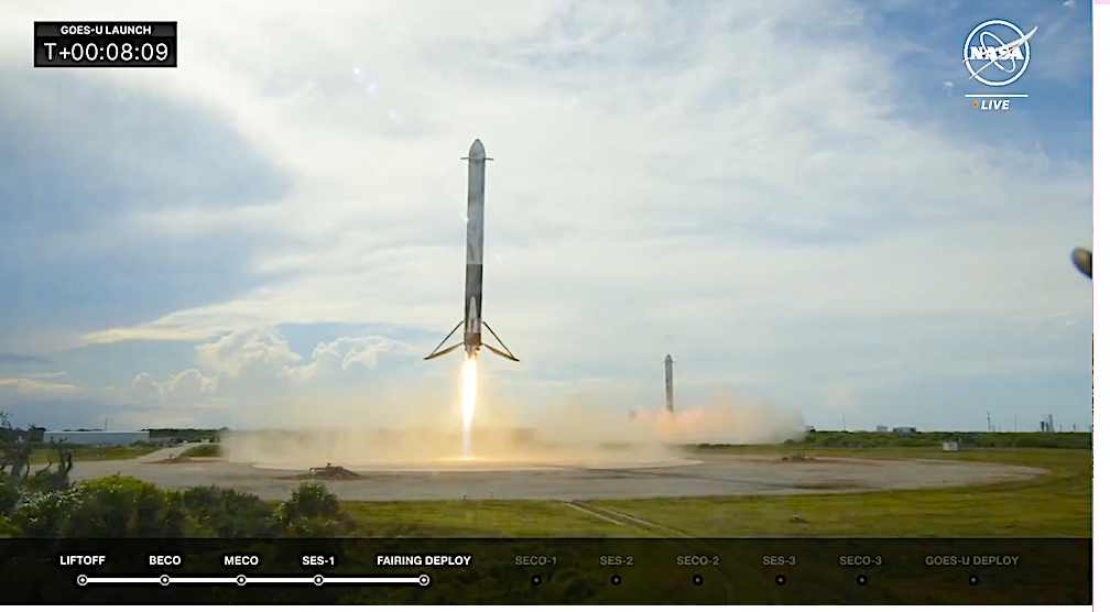 On Tuesday, June 25 at 5:26 p.m. ET, Falcon Heavy launched the National Oceanic and Atmospheric Administration’s (NOAA) GOES-U mission to a geostationary orbit from Launch Complex 39A (LC-39A) at NASA’s Kennedy Space Center in Florida. In addtion the event included a most impressive double booster landing of the Falcon Heavy’s side boosters (see below).