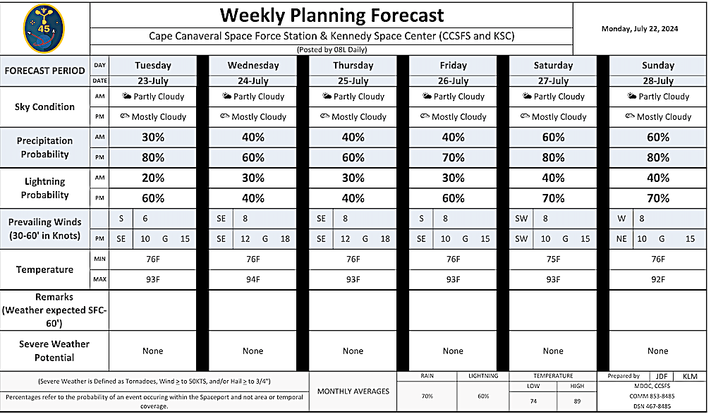 There are notices that SpaceX is planning a July 23rd launch of a batch of satellites for the Starlink mega-constellation pending FAA’s approval following the failure of the Starlink Group 9-3 mission. Scheduled for 9:14 PM – 1:44 AM PDT from SLC-40 Cape Canaveral’s SFS, Florida.