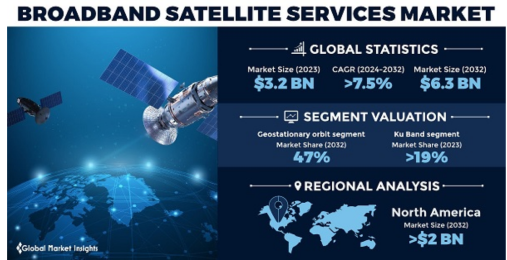 The Global Broadband Satellite Services Market size will grow at a 7.5% CAGR between 2024 and 2032, owing to the rising demand for reliable and efficient data transmission coupled with advancements in satellite technology, according to a new study by Global Market Insights.