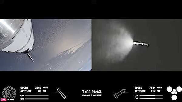 The Starship spacecraft, also referred to as the upper stage, rode atop the 232-foot-tall (71-meter-tall) Super Heavy rocket booster.