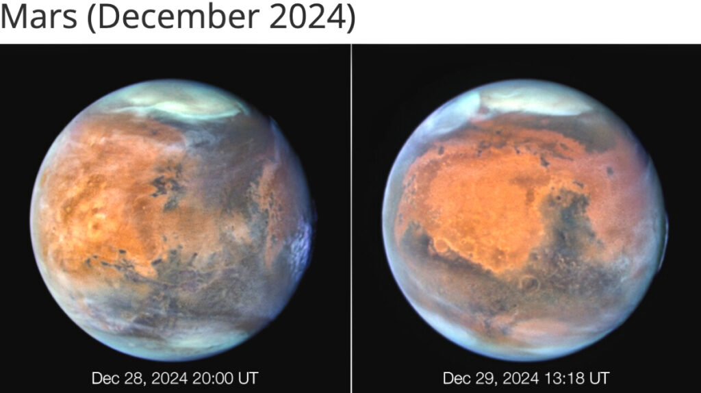 Mars: These are a combination of Hubble Space Telescope images of Mars taken from 28-30 December 2024. At the midpoint of the observations, Mars was approximately 98 million km from Earth. Thin water-ice clouds that are apparent in ultraviolet light give the ‘Red Planet’ a frosty appearance. The icy northern polar cap was experiencing the start of martian spring.