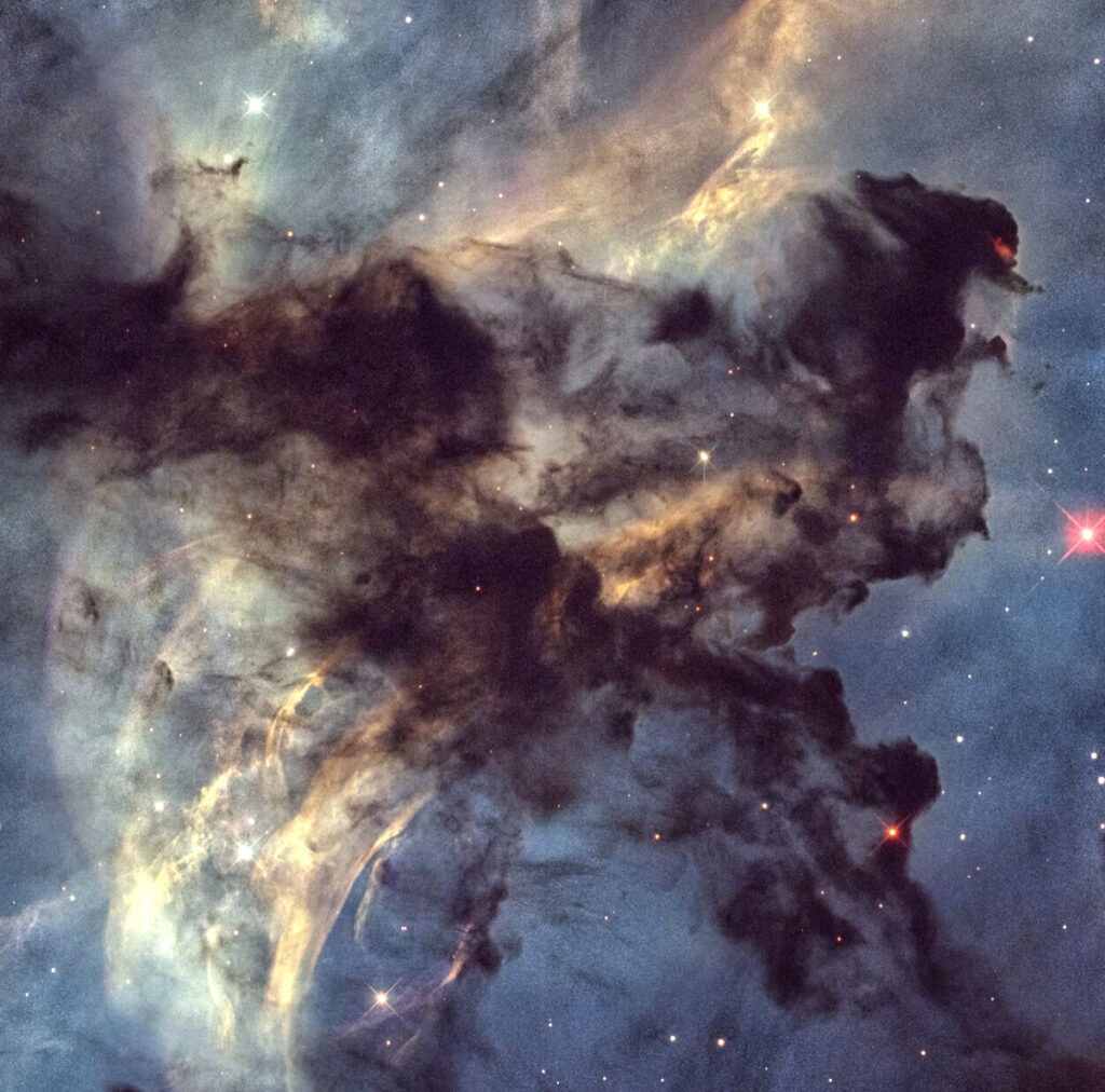 Rosette Nebula: This is a Hubble Space Telescope photo of a small portion of the Rosette Nebula, a huge star-forming region spanning 100 light-years across and located 5200 light-years away. Hubble zooms into a small portion of the nebula that is only four light-years across (the approximate distance between our Sun and the neighboring Alpha Centauri star system.) Dark clouds of hydrogen gas laced with dust are silhouetted across the image. The clouds are being eroded and shaped by the seething radiation from the cluster of larger stars in the centre of the nebula (NGC 2440). An embedded star seen at the tip of a dark cloud in the upper right portion of the image is launching jets of plasma that are crashing into the cold cloud around it. The resulting shock wave is causing a red glow. The colours come from the presence of hydrogen, oxygen and nitrogen.