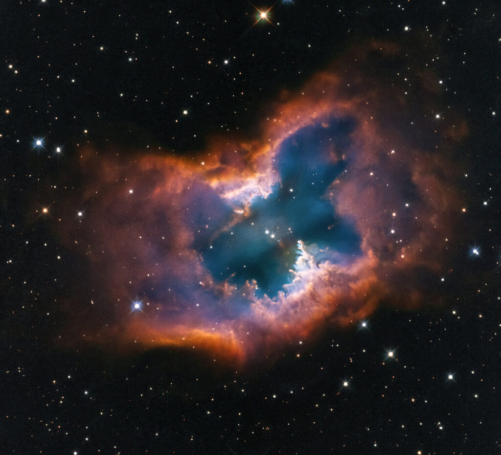 Planetary nebula NGC 2899: This object has a diagonal, bipolar, cylindrical outflow of gas. This is propelled by radiation and stellar winds from a white dwarf at the centre with a temperature of nearly 22 000 degrees Celsius. In fact, there may be two companion stars that are interacting and sculpting the nebula, which is pinched in the middle by a fragmented ring or torus – looking like a half-eaten doughnut. It has a forest of gaseous ‘pillars’ that point back to the source of radiation and stellar winds. The colours are from glowing hydrogen and oxygen. The nebula lies approximately 4500 light-years away in the southern constellation Vela.