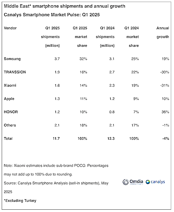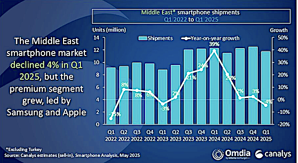The Middle East smartphone market (excluding Turkey) started 2025 on a subdued trajectory. According to Canalys (now part of Omdia), smartphone shipments in the Middle East fell 4% year-on-year to 11.7 million units in Q1 2025. After a strong rebound in 2024, the market is cooling amid softened retail demand and cautious consumption in early 2025. Even aggressive end-of-year promotions failed to offset the impact of rising economic uncertainty and increasingly sluggish consumer spending. Compounding the challenge, falling oil prices, intensified by new U.S. tariffs, threaten to place oil-dependent economies under financing strain, further weakening regional sentiment.
