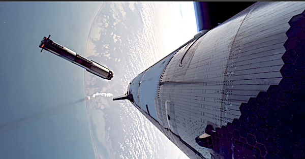 Following stage separation, the booster will flip in a controlled direction before initiating its boostback burn. This will be achieved by blocking several of the vents on the vehicle’s hotstage adapter, causing the thrust from Starship’s engines to push the booster in a known direction. Previous booster flips went in a randomized direction based on a directional push from small differences in thrust from Starship’s upper stage engines at ignition. Flipping in a known direction will require less propellant to be held in reserve, enabling the use of more propellant during ascent to enable additional payload mass to orbit.