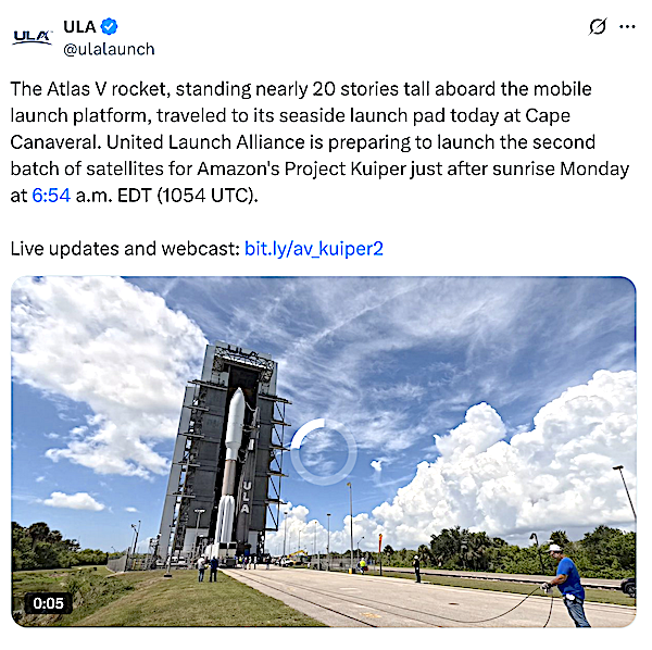 Space Station, Fla., June 10, 2025) — Due to multiple weather delays during launch processing, the launch of the United Launch Alliance (ULA) Atlas V 551 rocket carrying the second batch of production satellites for Amazon’s Project Kuiper, Kuiper 2, is now planned for June 16, 2025, pending range approval.