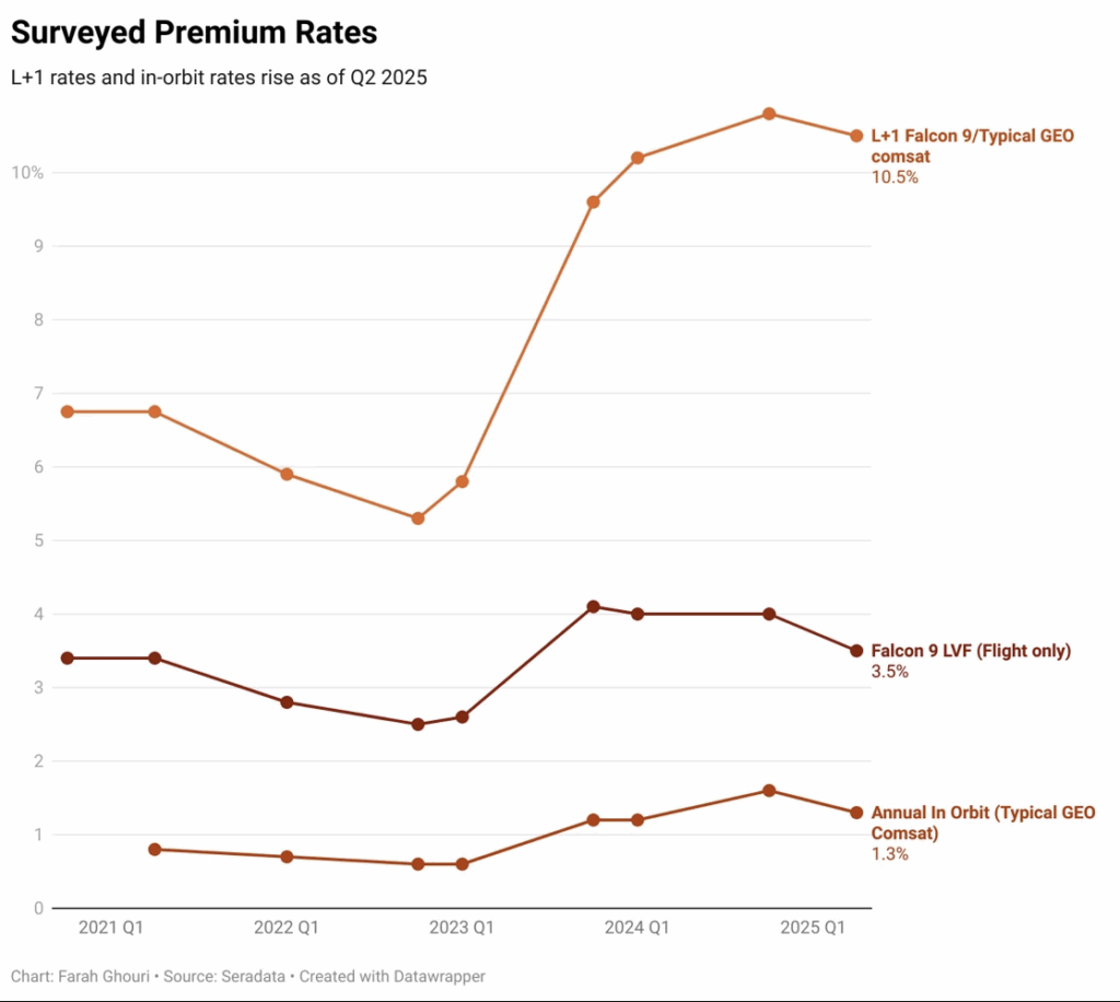 In general, during the first half of 2025, L+1 rates have fallen slightly. LVF rates have also fallen for some reliable rockets, e.g., the Falcon 9. The LVF rates are dependent on which rocket model is being flown and its recent reliability record. For example, the LVF rate for the PSLV has risen following a recent failure.
