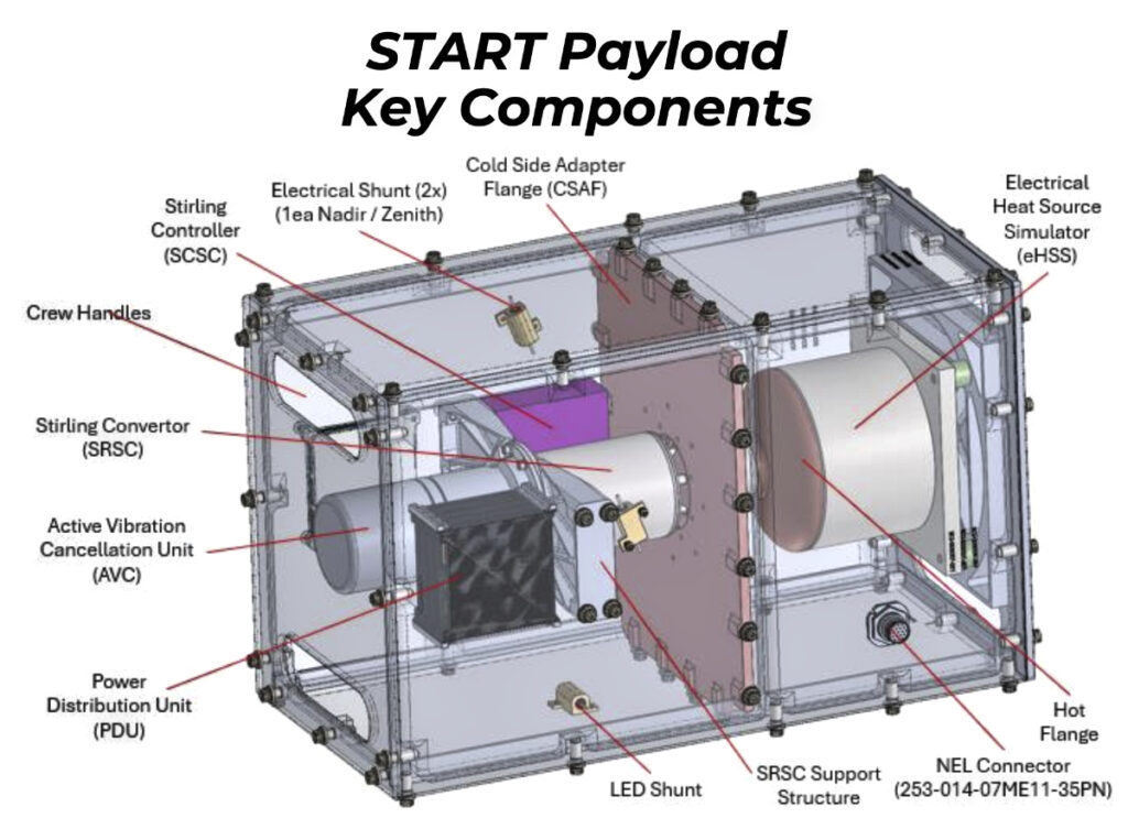 The Stirling Technology spAce Research experimenT (START) is a flight experiment designed to demonstrate Stirling power conversion technology in space. While onboard the ISS National Laboratory, the Stirling system will be exposed to conditions that cause conventional power systems to degrade more quickly, limiting their operational lifespan and cutting missions short.