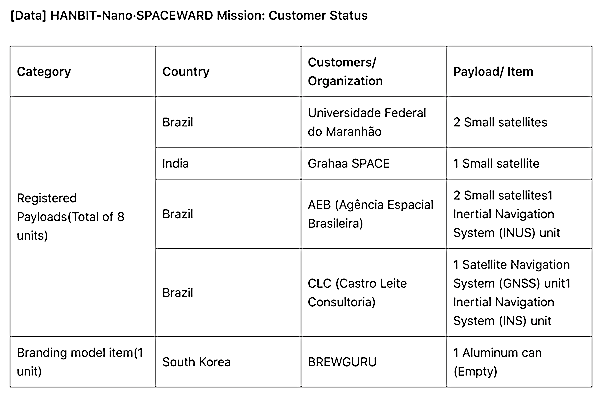 The SPACEWARD mission will deploy customer satellites into low Earth orbit (LEO) at an altitude of 300 km and an inclination of 40 degrees, while simultaneously performing experimental payload missions. A total of eight registered payloads, including five small satellites and three non-separating experimental devices, along with one symbolic branding model, will be aboard HANBIT-Nano.