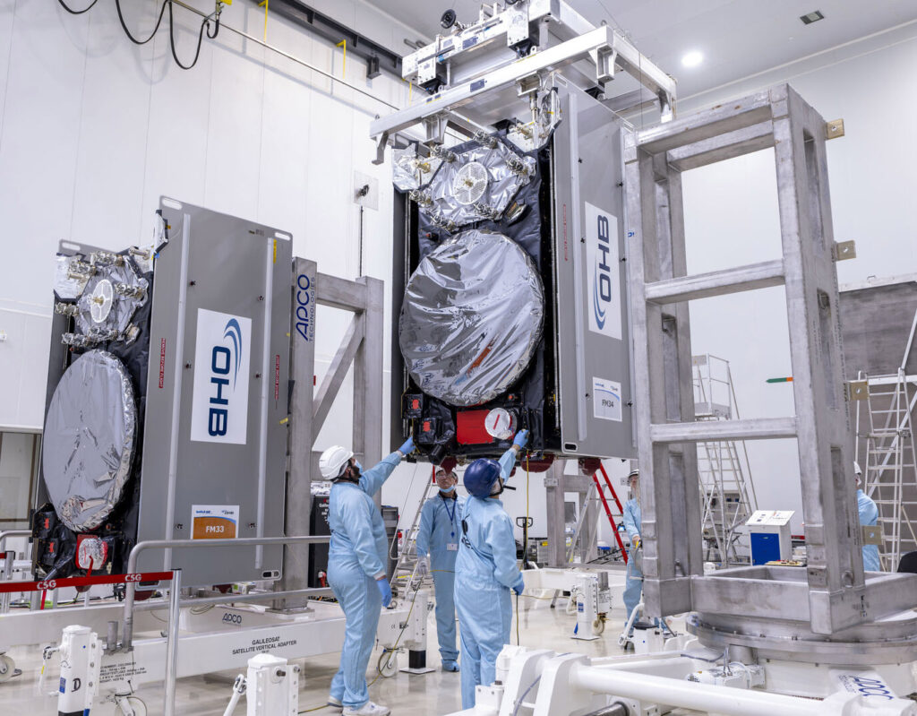 Following their journey from Europe, SAT 33 and SAT 34 are transported to the Spaceport’s clean room facilities. Over the next month, the joint team from ESA, EUSPA, Arianespace, and the manufacturer OHB will conduct a rigorous series of checks, including: