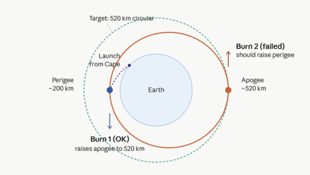 The New Glenn problem was with the upper stage which evidently failed to fire its engine correctly and which resulted in the satellite being stranded in a low orbit (“non-nominal”) that was too far from its intended location. The satellite was not carrying sufficient fuel to enable a repositioning under its own power.