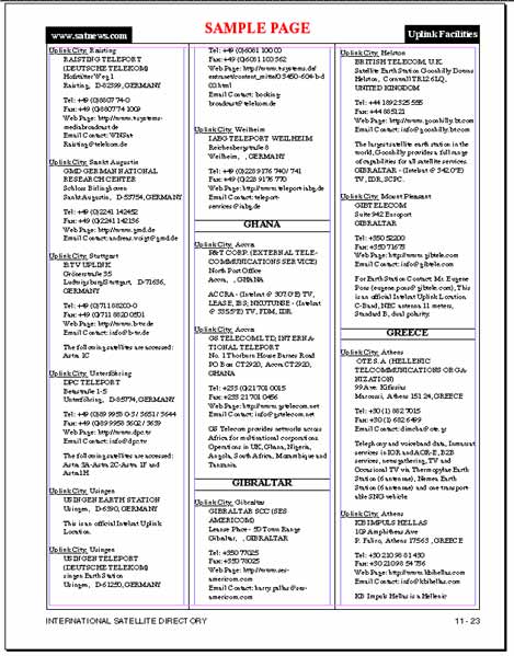 UPLINK FACILITIES - Location; Operator Name & Address; Satellite Orientation; Capabilities & Services Provided. Click here for sample page.