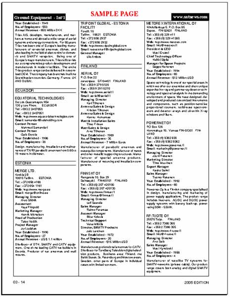 MANUFACTURERS OF SATELLITE GROUND EQUIPMENT - Amplifiers; Antennas; Baseband Equipment; Cable; Converters; Complete Earth Stations; Feed Systems; Filters; Modems; Modulators; Multiplexers; Positioners; Power Supplies; Processors; Software; Teleconferencing Products; Test & Diagnostic Equipment; Transmitters; VSAT�s and many other products. Includes descriptive details on the fast growing DBS market Click here for sample page.