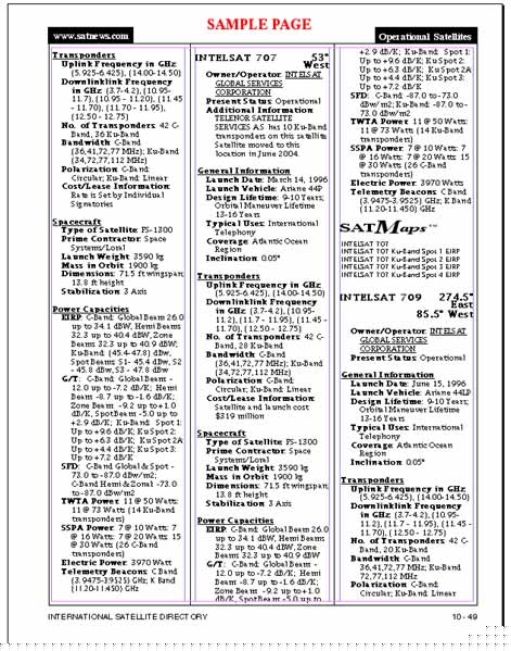 GEOSYNCHRONOUS SATELLITES - Complete information on over 450 satellites including their mass, dimension, location, date of launch, number & type of transponders, users, operators, and many other relevant facts. Click here for sample page.